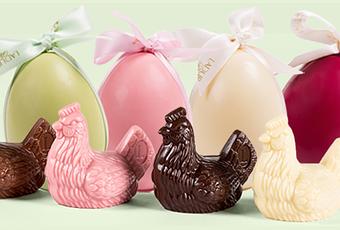 Oeuf en chocolat blanc coloré griotte : Oeuf au chocolat blanc coloré de rouge et garni de fritures aux chocolats noir et lait. 15 €