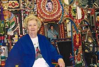 Elayne Goodman, vie à Columbus, Mississippi. Elvis Presley, l'artiste le plus populaire du vingtième siècle, symbole des États Unis d'Amérique au même titre que le Coca Cola ou la bannière étoilée, authentique œuvre d'art " red neck " ambulante, ne pouvait que combler la frénésie monomaniaque d'une Elayne, infirmière à la retraite de l'état du Mississippi qui n'a de cesse de décliner son idole sous toutes les coutures, de préférence pailletées. La touchante devotion qui anime ses retables psychédéliques la sauve d'une simple " kitscherie " supplémentaire et nous permet d'y croire à notre tour