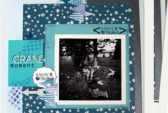 Pour le décor, j’ai utilisé bien évidemment, les cartes de project life du Cactus bavard. J’ai donc collé une carte 7,5 x 10 cm « un grand moment » et découpé l’étiquette dans une carte bleu à ligne et étiquettes. Ces cartes font parties du camaïeu bleu du thème Famille. J’ai ensuite utilisé les tampons Aladine Fanions tamponné sur du papier blanc et ensuite découpé. Les tampons Lorelaï Design « Les petits mots Amour toujours » sont idéaux pour finaliser vos pages. Une flêche (formes découpées Toga) sur mousse 3D, des symboles noirs (production formes découpées Cactus bavard) et ma page est terminée !