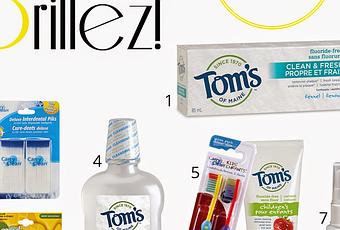 1. Dentrifice Sans Fluorure à la Fenouille, Tom’s of Maine2. Cure-Dents Deluxes, Carry Clean3. Baume à Lèvre Soulagement des Feux Sauvages Extrêmes, Lypsyl4. Rince-Bouche Sans Alcool, Tom’s of Maine5. Brosse à Dents pour Enfant, Carry Clean6. Dentifrice pour Enfant, Tom’s of Maine7. Vaporisateur pour la Bouche Sèche, Mouth Kote