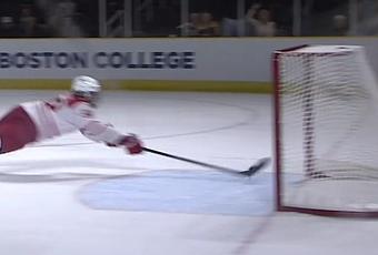 Louie Belpedio a réalisé un geste très spectaculaire lors d’un match face l’équipe de Providence en hockey sur glace. Quel sauvetage !