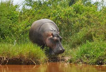 vus au détour d'une rivière, une famille d'hippopotames prête pour le bain.