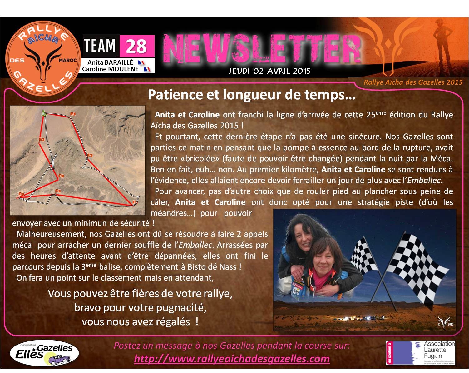 Dernière ligne droite. Pour finir en beauté, les Gazelles ont eu le droit à une étape en boucle plutôt courte de 120 kilomètres. Celles qui veulent monter sur le podium resteront concentrées. Pour les autres, après 8 jours de pratique intense, les résultats sont là. Elles prennent le cap de plus en plus précisément. C’est la meilleure des récompenses pour elles.Anita et Caroline terminent en beauté malgré des ennuis mécaniques. Elles terminent 8èmes de l'étape, mais 6èmes au classement général.Il paraît que la soirée a été bien animée... on veut bien le croire et c'est bien mérité. Bravo les Gazelles !
