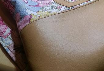 Ya peu, j'ai trouvé du simili cuir à Djibouti. Bingo, je choisis le beige. J'y associe le liberty que j'adore, Mauvey. Un tissu en popeline vert pomme pour la doublure intérieure, qui paraît bien plus fluo qu'en vrai sur les photos.