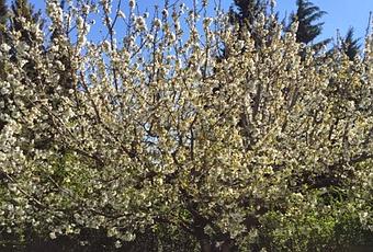 Le petite cerisier est en fleur lui aussi. Mais il montre des faiblesses coupables. Des branches paraissent mortes. Il faudra passer à la découpe, pour tenter de lui redonner un peu de peps.