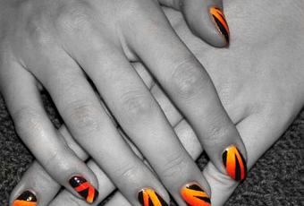 Sur une base de jaune, j'ai fait un dégradé jaune / orange / rouge puis j'ai recouvert partiellement d'un vernis gris très foncé.