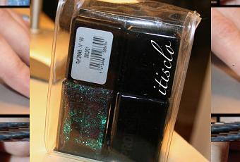 Voici un kit que j'ai acheté dans un Pronails spa. C'est un kit Caméléon composé d'un vernis noir et d'un vernis pailleté. J'ai pris le pailleté vert/rose mais il y a aussi le pailleté or/rouge.