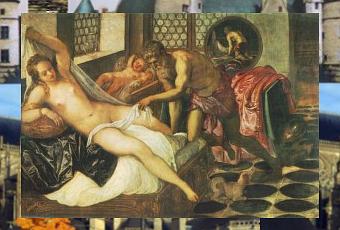 Nous découvrons, tout d'abord, que le Tintoret peut être comique, voire un tantinet coquin : si, dans Venus et Mars surpris par Vulcain, le pauvre Mars, réfugié sous une table, se trouve dans la position ridicule de l'amant de comédie, Vulcain ne l'est pas moins. Penché sur sa femme, il est littéralement fasciné par... son sexe, complaisamment montré ; et un miroir, en arrière-plan, montre la suite immédiate de l'action : Vulcain grimpe sur le lit et oublie ses griefs !...