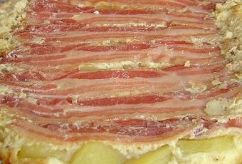6 grosses pommes de terre - 8 fines tranches de lard fumé - 3 oeufs - 200 ml de crème fraiche - 1 petit reblochon - 100 g de gruyère râpé - 1 pâte feuilletée - sel et poivre.