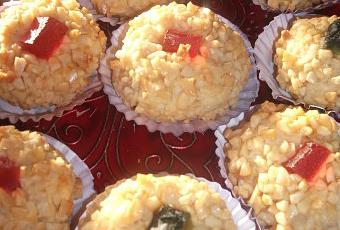 Les tremper dans les jaunes d'oeufs battus et les passer dans les amandes hachées. Garnir d'une demi cerise puis poser sur une plaque et faire cuire à four moyen. Présenter dans des godets plissés