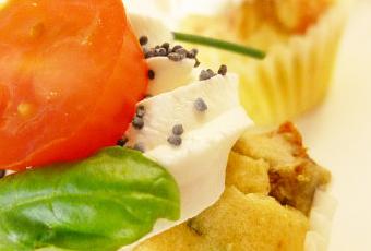 Je les ai réalisé en deux versions toutes mini {caissette de 4 cm} pour n'en faire qu'une bouchée : tomates confites-basilic-parmesan et saumon-aneth.