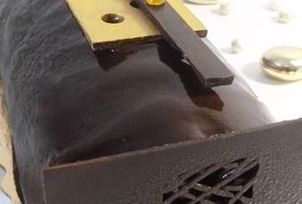 Cette dernière est composée d'un biscuit brownie, d'une couche croustillante de feuillantine, d'une mousse à la vanille bourbon, d'un insert de caramel au beurre salé et amandes, d'une mousse au chocolat et fève tonka, le tout recouvert d'un miroir au chocolat