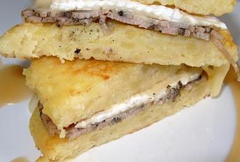 Prendre une galette, posez deux tranches d'andouille et du camembert ; refermez avec une autre galette.