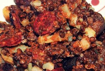 1 grosse boite lentilles - 2 pommes de terre - 1/2 chorizo (fort pour moi)- 2 saucisses - 1 poivron vert - épices espagnoles (facultatif).
