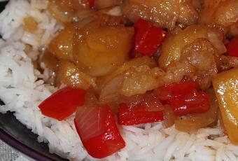 Dans un wok ou une poele, faites chauffer l'huile ajoutez l'oignon et le poivron coupés en dés, ajouter l'ananas coupé en dès, le sucre, la sauce de soja, le vinaigre et 1 grand verre d'eau. Mélangez et salez. Faites épaissir la sauce avec la farine diluée dans 1/2 verre d'eau. Jeter les beignets dans la sauce et servir rapidement.