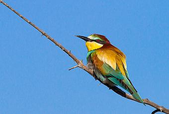 J'espère que cela vous plaira ! Alors pour commencer, un peu de ciel bleu avec le Guêpier d'Europe. La photo a été réalisé en affût à distance de 5 mètres environ d'un arbuste sec dans le sud de la France en mai 2013.