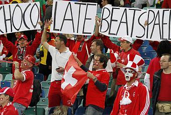 Après l'éternelle question "c'est qui le plus fort entre l'éléphant et l'hippopotame ?" très justement soulevée par Dominique Farrugia et restée en suspend jusqu'à présent, ces supporters suisses bien inspirés apportent une réponse marquée au combat chocolat vs paella. En attendant ce soir et le match camembert vs tequilla... ;-)