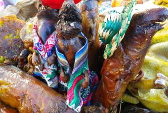 Ce qui est intéressant c'est qu'à chaque fête au Pérou est attribué un plat ce qui est plutôt pratique car après avoir marché quelques heures pour voir processions, danses et festivités diverses, on peut se reposer un instant autour d'un plat original, inconnu et souvent délicieux préparé par des péruviens fiers de leurs traditions.