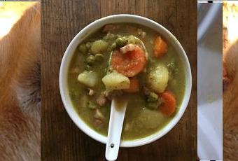Ingrédients pour Ma Potée de légumes : 200g de lardons fumés, 5 poireaux, 4 carottes, 3 pommes de terre, 100g de petits pois, 3 cs de bouillon bio de légumes déshydraté, de l'eau, 2cs d'huile de tournesol, poivre, pain