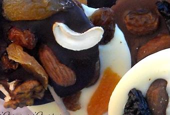 Casser le chocolat en morceaux,faire fondre au bain marie séparément,ajouter les 4 epices au chocolat noir.Verser aussitôt,des cuillères à soupes de chocolat sur une plque tapisser de papier de cuisson,laisser le chocolat s'étale,enfoncer un pic en bois au milieu et parsemer de fruits secs.Laisser durcir,Détacher les délicatement .