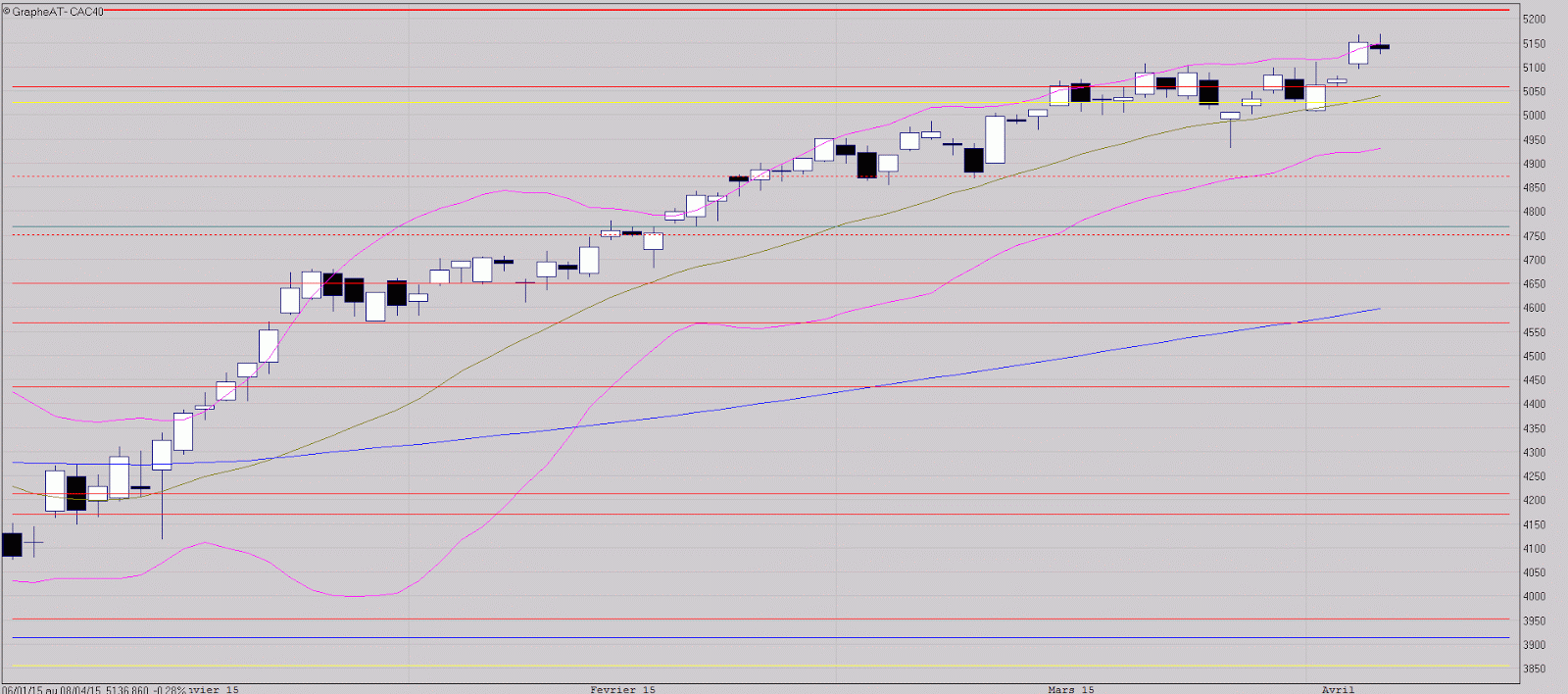 C'est un mouvement assez timide qui s'est opéré aujourd'hui en direction de la fenêtre ouverte hier. La petite bougie noire issue de cette séance est assimilable à un doji qui s'est formé après l'ouverture de la fenêtre correspondant davantage à une bougie d'hésitation dans la logique du test de la fenêtre qu'à la formation d'un harami. Il reste encore quelques séances pour connaître le sort de cette fenêtre; il va de soi que sa validation lancerait le signal de la reprise de la hausse au-dessus des 5100 points. Son invalidation (peu probable je pense) ramènerait immanquablement le CAC vers les 5000 points avec un risque de rechute sous ce support.