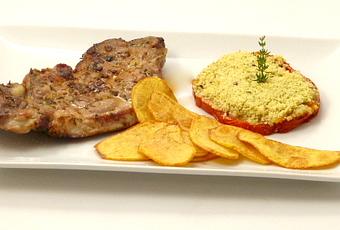 Les ingrédients : côtes de porc, huile d'olive, marinade mélange LOUISIANE de Florisens, 1 tomate coeur de boeuf (du jardin pour moi !), 30 gr de beurre, 30 gr de farine, 30 gr de parmesan, thym, pommes de terre.