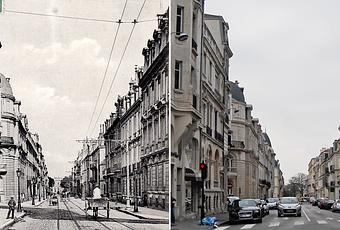 Les rails de l'ancien tramway sont encore visibles entre les pavés et le goudron.