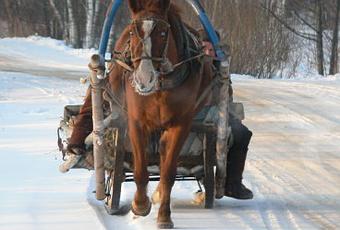 En arrivant au village de Babynino, 1 troïka (qui en fait n'en est pas réellement une, parce que les puristes vous diront que la vraie troïka est tirée par 3 chevaux) passe son chemin. Je fais arrêter le bus pour photographier l'attelage. J'ai l'impression d'être projetée dans un roman de Tolstoï. C'était irréel de voir ce couple de vieux, chaussés de valenki, vêtus de chapkas et assis sur une luge de bois très rustique.