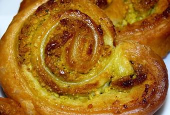 Déroulez la pâte feuilletée e et decoupez-la de façon à obtenir un rectangle. Etalez le pesto de dessus. Roulez deux tours d'un côté de la pâte et roulez entièrement de l'autre côté afin d'obtenir un " escargot ". Mettre au congélateur 30 minutes environ. Découpez le " boudin escargot " en tranche d'environ 1 cm et déposez sur une plaque recouverte de papier cuisson. Faites cuire 12 minutes dans un four préchauffé à 210°C (th7).