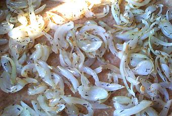 Quand la chaleur se fait estivale, l'appétît se modère et les envies de plats faciles, rapides et sentant les beaux jours font leurs apparitions.(lorsque la période n'est pas au régime comme en ce moment !).Un petit lit d'oignons revenus à l'huile d'olive (pour l'accent du sud), du thym et on couche les tomates Roma (car c'est une variété qui a peu de jus et de pépins) ! S'il reste un peu de mozzarella ou de feta dans le frigo, on parsème et on enfourne !