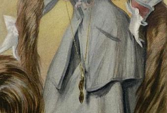 Ce costume d'après-midi, en tissu anglais rayé gris et blanc, est composé d'une jupe longue et unie et d'une jaquette avec un col de velours ouverte sur une blouse chemisier à jabots de lingerie. Une longue écharpe, un manchon en renard et un grand chapeau de style à plumes complètent le tout.
