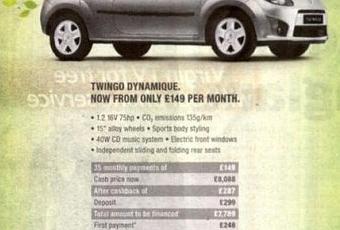 L'affaire s'est produit à Londres, et a poussé l'équivalent de notre CSA, l'Advertising Standards Authority, à imposer à Renault le retrait de publicités vantant les mérites écologiques de la Twingo Dynamique. Dans cet encart publié dans la presse anglaise, Renault présentait le véhicule comme émettant des feuilles en sortie du pot d'échappement avec le slogan : "économique, écologique". Par ailleurs, l'organisme de régulation a émis des doutes sur le logo 'eco2′, largement utilisé par la marque au losange pour promouvoir ses actions en matière de réductions des émissions de CO2 : "Nous notons que l'encart mentionnait des informations sur les émissions de CO2 du véhicule mais considérons que c'est insuffisant pour justifier l'impression générale évoqué par la publicité, notamment les feuilles vertes sortant du pot d'échappement [...] Nous avons conclu que la publicité exagérait les bénéfices environnementaux de la Twingo, à tort". l'ASA note aussi que la TWINGO n'est pas franchement bien placée en termes d'émissions de CO2 : avec un classement C, elle est loin de figurer au TOP10 des voitures les plus vertueuses.