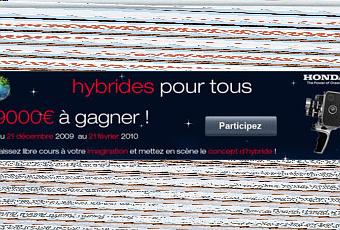 La marque Honda a lancé à la fin du mois de décembre un concours créatif sur le thème des moteurs hybrides. L'objectif pour les participants est de réaliser une courte vidéo montrant ce que représente, pour eux, le concept d'hybride. Les vidéos gagnantes les plus originales, créatives et les plus appréciées se partageront la somme de 9 000 €.
