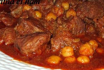 ensuite ajouter le a la viande continuer a faire revenir ensuite couvez d'eau et ajouter les pois chiche et laisser cuire