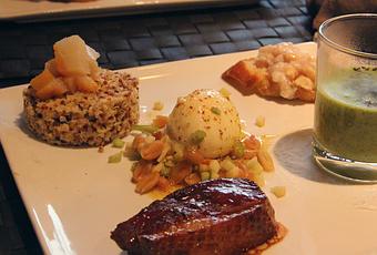 Au programme : smoothie fruits exotiques, entremet vanille brillat savarin, roulés au thym, gâteau chocolat lavande, glace fromage blanc et ananas.
