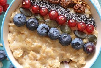 Des flocons de céréales (traditionnellement d'avoine, mais vous pouvez bien sûr opter pour des flocons sans gluten), chauffés dans du lait (végétal, ici). En résulte une sorte de bouillie crémeuse et onctueuse que vous pouvez agrémenter par la suite à l'envi.