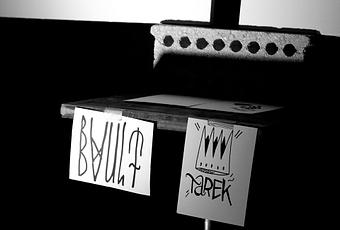 Maintenant, fini de saliver, descendons l'escalier pour aller dans la cave... Là une scène est installée avec deux grandes toiles et des tablettes sur lesquelles sont déposées les " armes " des artistes : les fameux marqueurs (P.... ?) ! Une affichette positionne les deux concurrents du soir : Bault à gauche et Tarek à droite. Après une rapide présentation, la battle peut commencer. Les deux street artistes ont exactement 90 minutes pour réaliser une oeuvre. Ensuite, le public vote à l'applaudimètre ainsi qu'un jury composé de 2 personnes (dont Wonder Brunette).