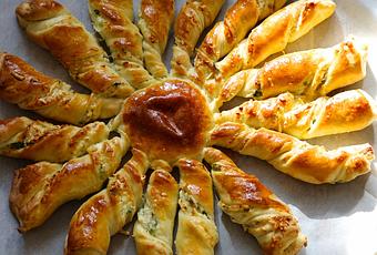 In a large bowl , mix all of the ingredients of the dough . Knead it for 7 minutes . Let it rest for 50 minutes or until it rises . Preheat oven to 200°C. Divide the dough in two equal parts and with a rolling pin flatten each piece of dough into a disc of 25 cm diameter . Place the first disc on a baking tray with baking paper . Spread the ricotta , add fresh herbs and grated cheese , salt and peper . Place the second disc on the top .Place a glass in the centre and press it lightly . Divide the dough in four equal parts , keep on dividing each quarter into 4 equal parts . You should have 16 segments. Hold the tip of each piece and twist in 3 times . Wash the top with an egg yolk . Bake for 25/30 minutes .