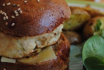 Les pains à burger étaient absolument parfaits ! Croustillants dehors, moelleux dedans, super bien gonflés, le top ! Nous les avons garnis des steak de poulet, d’oignons revenus à la poêle et de tranches de beaufort et je les ai servis avec des pommes de terre grenaille aux herbes.