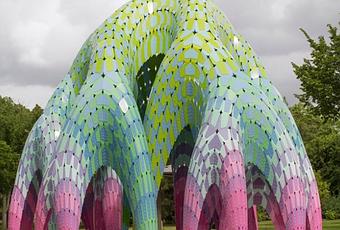 Dans un parc de Edmonton, au Canada, l'architecte Marc Fornes a imaginé un pavillon avec des couleurs vives fabriqué à partir de bardeaux d'aluminium.