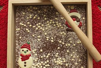 Le chocolat en question, est un chocolat à casser qui vient de chez Le comptoir de Mathilde. Il vient avec un petit marteau en bois qui vous permet de briser la tablette en mille morceaux. Je ne vous dit pas l'euphorie de mes fils ! "On peut vraiment frapper le chocolat avec le marteau !!! ???? Mais, on va le manger après, hein ???".
