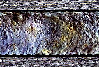 Une carte inédite de cet astre de 950 km de diamètre, encore jamais visité — c’est en effet le premier rendez-vous de l’histoire de l’exploration spatiale avec une planète naine —, montre une surface plus couverte de cratères qu’imaginée auparavant, mais qui cependant, en compte relativement peu qui sont de grandes tailles. « Cette planète naine n’était pas juste un rocher inerte tout au long de son histoire » explique Chris Russell, directeur scientifique de la mission basée à l’université de Californie, « elle était active avec des processus qui ont abouti à l’émergence de différents matériaux selon les régions. Nous allons commencer à capturer cette diversité sur nos images couleur ».