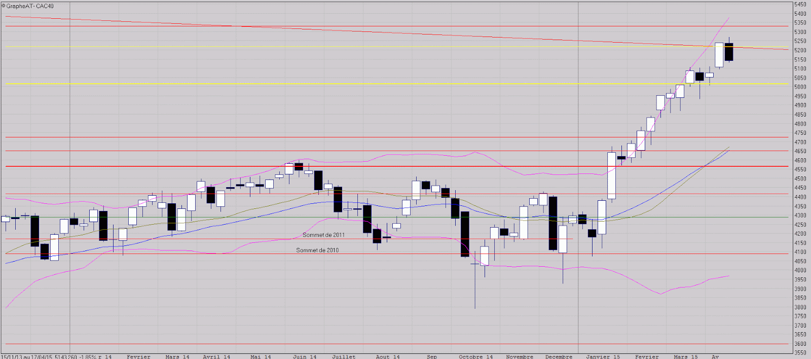 Le 1er support se trouve sur les 5015 points, mais en considérant un retracement de l'ensemble de la hausse de ce 1er trimestre, c'est plus vers le support des 4810 points (voire celui des 4725 points en cas d'excès vendeur) que le repli devrait être attendu.