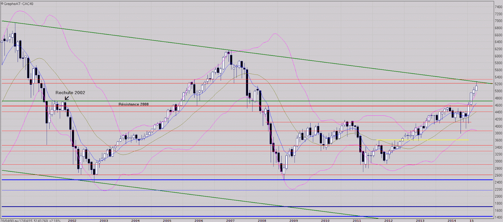 Cette correction, si elle se déroule selon ce scénario, ne remettrait pas la tendance long terme en cause et serait alors à l'origine d'un nouveau mouvement haussier capable de faire sortir le CAC de son couloir baissier dans lequel il est enfermé depuis 15 ans.
