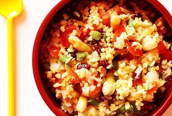 Ajoutez 1 boîte de thon au naturel (110 g égoutté) émiettée, 350 g de tomates cerises coupées en petits morceaux, et 100 g de cranberries séchées.