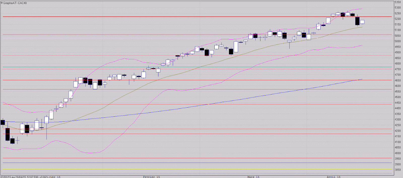 La bougie noire apparue vendredi dernier est la plus grande qui s'est formée depuis mi-janvier. Hormis sa taille, c'est l'invalidation de la fenêtre haussière qu'il faut retenir, mais la bougie blanche formée hier peut aussi signifier que cette bougie noire correspond à la fin de la période de consolidation marquée par une pointe baissière. En tout cas, avec le début de séance de cette journée, il est fort possible cette pointe baissière ait mis fin à la phase de consolidation et que le marché reprenne sa hausse. Le risque d'une reprise baissière à très court terme ne peut cependant pas être écarté. Seule une reprise immédiate au-dessus des 5218 points confirmerait la reprise haussière.