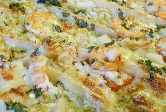 6°- Déposez les tranches de tomates, puis la chaire des crabes, ainsi que les langoustines;crevettes et morceaux d'asperges