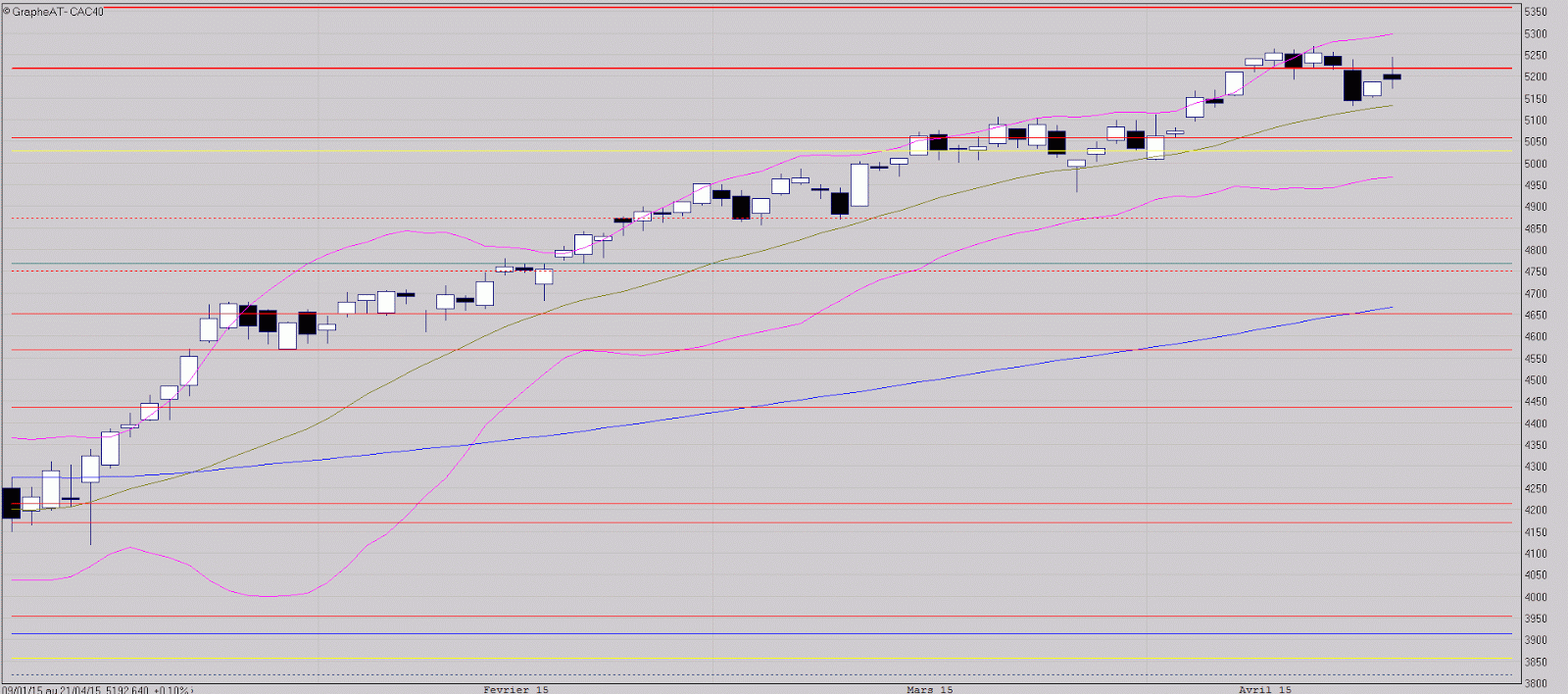La reprise au-dessus des 5218 points a échoué hier. L'ombre haute de la bougie noire témoigne de cet échec, mais il faut également noter que la pression baissière n'a pas été très convaincante. Nous restons à l'issue de cette séance dans une phase d'hésitation après un trimestre fortement haussier et si le marché doit grimper jusqu'à la prochaine résistance des 5360 points, il le fera de façon hésitante. Le risque d'un décrochage sous les 5058 points n'est cependant pas écarté. Dans ce cas, la correction s'aggraverait mais sans remettre en cause le caractère haussier du marché.