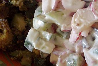 Raïta de concombre et radis express: 1/2 botte de radis 1 concombre 1 cuillerée à soupe de moutarde à l'ancienne 1 yaourt de brebis