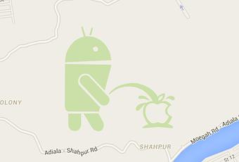 Inutile de spécifier que lorsque l’on bascule vers le mode montrant la photographie satellite, l’image de l’androïde qui se soulage ne se traduit pas par une plantation d’arbres reproduisant l’illustration en question.